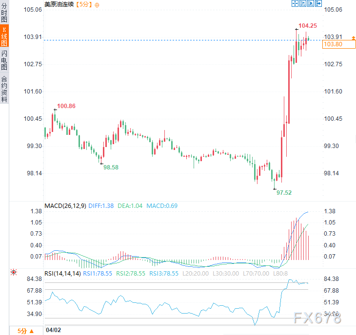 言语本领,好意思原油价钱快速拉升近6好意思元,现交投于每桶104好意思元隔邻,日内涨幅约4%,扭转早盘逾2%的跌幅%。