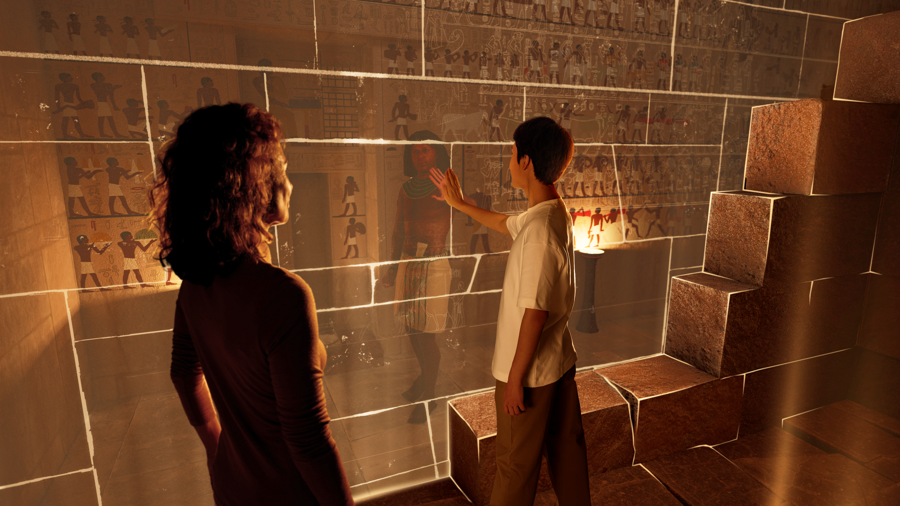 在45分钟的体验中,不雅众将戴上面显成就,在埃及古物学家兼导游“莫娜”的率领下,“回到”金字塔的建造现场,解锁“为什么要建造”、“若何选址与盘算”、“石料从何而来”、“若何打破时期难点”等一连串的问题。在这段旅程中,东谈主们将“穿越”代赫舒尔坟场,近距离斗争斯尼夫鲁金字塔,来到运送建筑所需石料的船只停泊的场地。跻身其间,还将遭受正在责任的建造者,以及金字塔工程的总郑重东谈主安赫哈夫、管工梅勒等。
