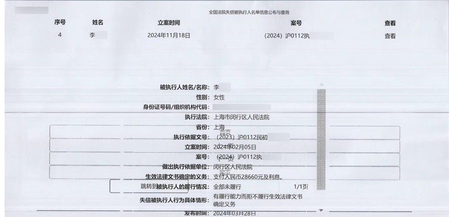 让两名保姆震惊的是,经多方打听得知,李某自2023年起就已被多家法院列为失信被执行人,限制高消费。多次上门讨要欠款无果后,无奈之下只能选择报警求助。