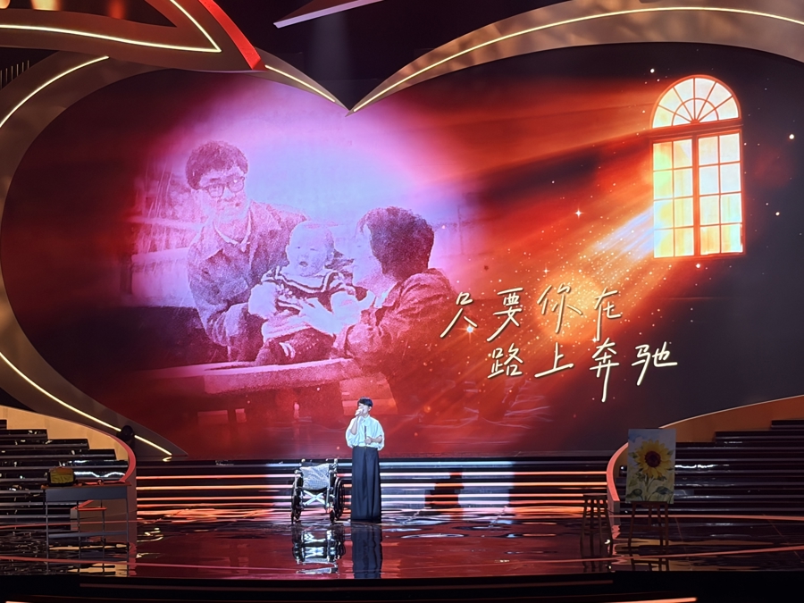 而后,舞台剧《轮椅上的爱》再次将晚会气氛推向高潮,赢得了全场的掌声。扮演“轮椅校长”房金妹儿子刘闻亮的演员,在舞台中央轻轻推动母亲的空轮椅。
