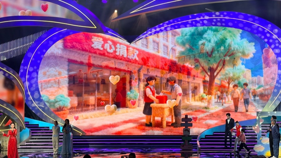 开场表演光影阵列舞蹈《微光成炬》率先点亮温情氛围,利用光影交汇,将观众缓缓引入慈善的温暖语境中。阿卡贝拉叙事诗《在路上》,以纯人声的悠扬旋律,串联起了过去一年发生在申城的三个温暖故事。它是骑手九年如一日的助老送餐,是铁路线上上百台AED组成的5G急救网络,是跨越四千公里、为震区重建家园的建筑团队。一个个微小的善意汇聚,最终凝结成蔓延整座城市的“大爱”暖流。