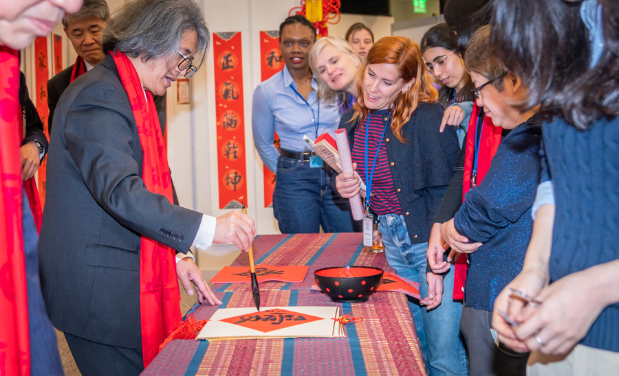 现场设置的书画展台和美食展台人气爆棚,吸引来宾竞相体验。书法展台一派红火气象,中国书法家协会名誉主席苏士澍、中国职工书法家协会主席郑晓华等书法家们挥毫送“福”到联合国,受到来宾们的热烈欢迎。活动当天恰逢腊八节,现场宾客一起品尝腊八粥、桂花米糕、串串香等中国美食,共享来自中国的新年味道。