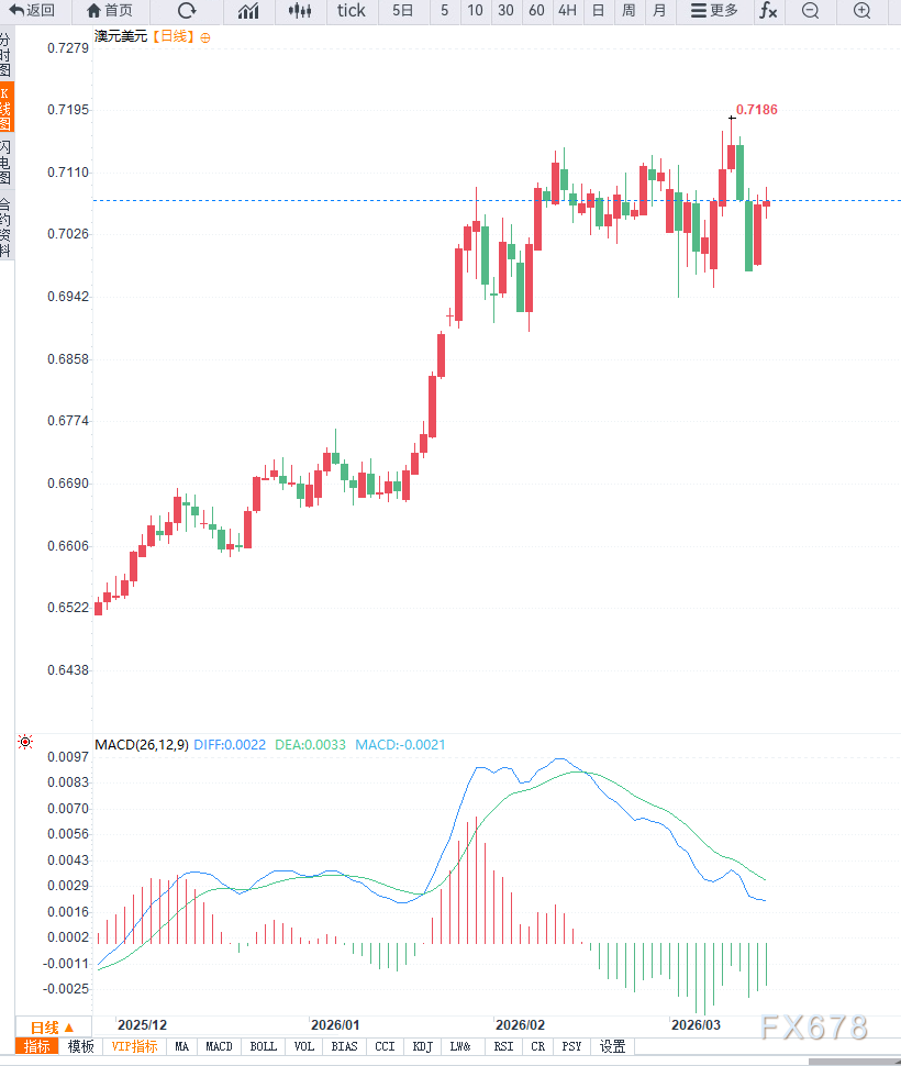 日线图透露,天津期货配资澳元兑好意思元(AUD/USD)近期在 0.7000-0.7150 区间飘荡整理。现时汇率约在 0.7080 近邻,短线受利率上调及油价高潮影响承压。要津阻力位为 0.7100、0.7150,阻拦可能触发进一步反弹;赈济位为 0.7030、0.7000,跌破将增多回调风险。4小时图透露短线在 0.6980-0.7100 区间整理,均线趋平,MACD徬徨零轴近邻,透露短期动能偏弱,市集可能督察飘荡面孔。