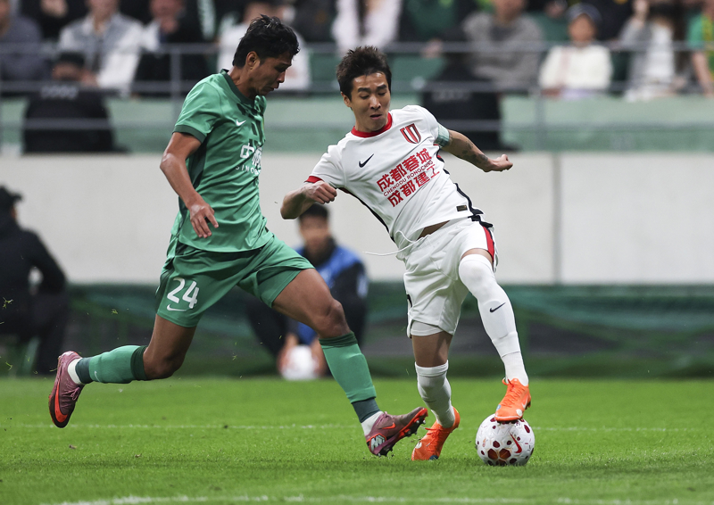 4月12日,成齐蓉城队球员韦世豪(右)在比赛中控球。\n 4月12日,在2026赛季中国足球超等联赛第五轮比赛中,北京国安队主场1比2不敌成齐蓉城队。\n 新华社记者 廖宇杰 摄