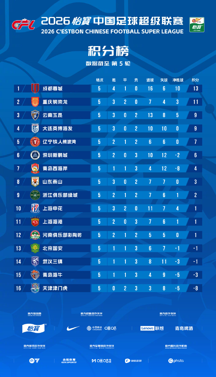 中超5轮之后的积分榜,成齐蓉城暂时领跑。