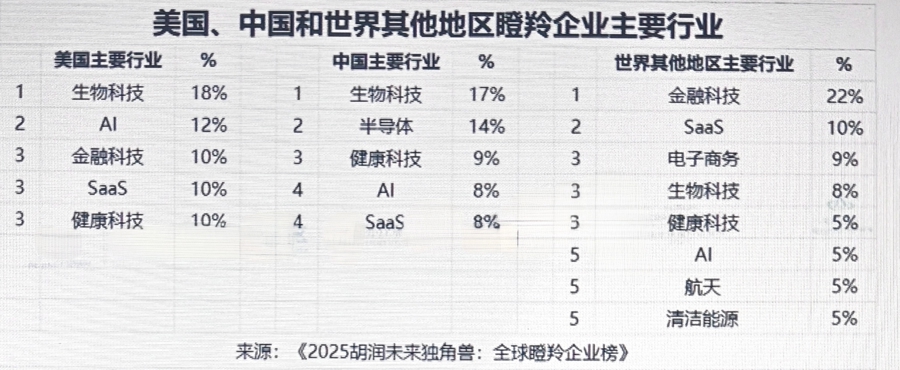胡润集团董事长兼首席调研官胡润在介绍全球瞪羚企业榜单时指出,如果把这个榜划分,全球实际就是三大块,即美国、中国、全球其它地区。从全球瞪羚企业在这三大块的主要行业看,美国和中国排在第一的行业都是生物科技,分别占该国瞪羚企业总数的18%和17%,上年的榜单两国排第一的行业也是生物科技。而世界其它地区排第一的行业是金融服务。AI在美国排第二,在中国排第四,中国排第二的是半导体。