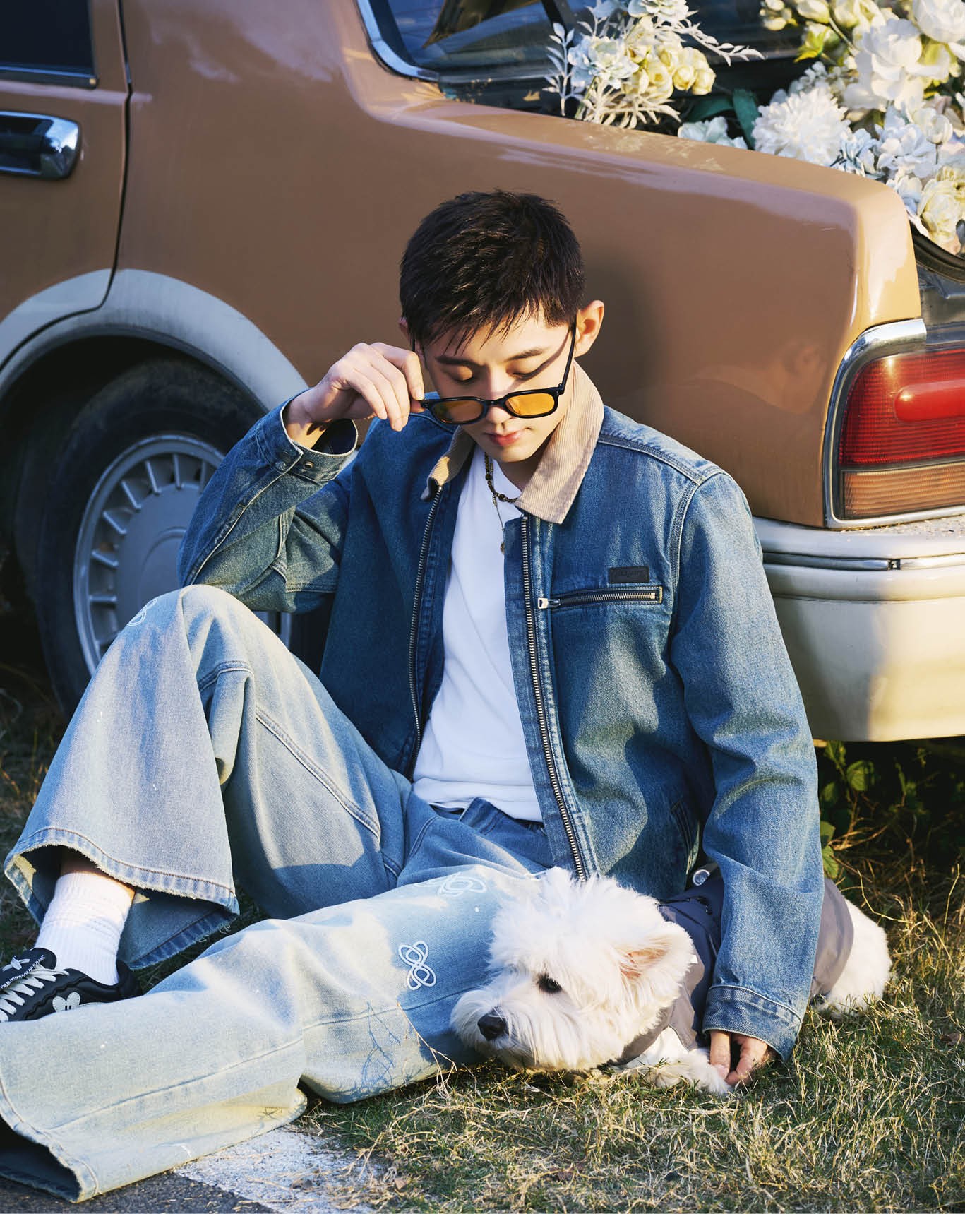 冬日的江南,如此迷人。如果不是坚定地朝前走,拍摄地点很难找到,那是一幢白色双层建筑,位置很隐蔽。小楼前面的空地,停靠着一辆日系皮卡车,被鲜花簇拥。阳光映衬得刚好,半小时前,张继科抱着宠物小狗“金牌弟弟”,刚刚在皮卡车前完成一组拍摄。