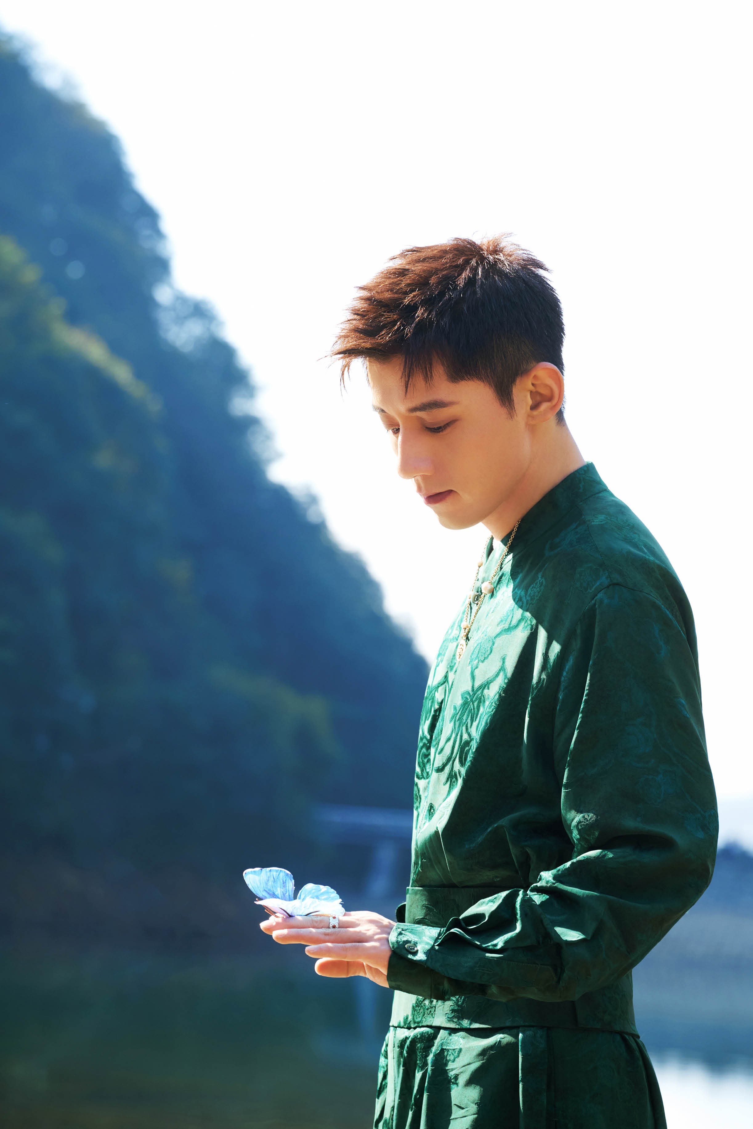 往远处望去,大洋坞水库旁的风,吹起了张继科墨绿色古风裙摆,一只蝴蝶停在他的手背,扇动着翅膀。仿佛在诉说着一个似近又远的故事——是回望,也是畅想。