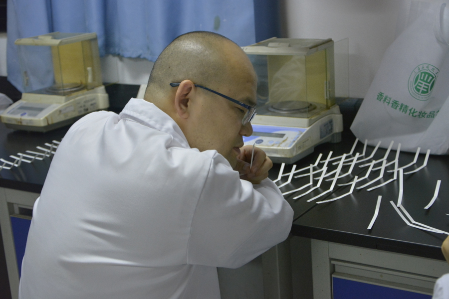 线下学习的实操环节,最令人兴奋,也最能体现“调香师是技术与艺术的结合”。在实验室中,祁奕对着浸满各种香味的纸条嗅闻——“闻香”;辨别水果香味、花卉香味,辨别香味的浓郁程度——“辨香”;最后,根据上课要求,现场调配一款指定的香精,比如茉莉花味、玫瑰味、香蕉味、菠萝味。“虽然书上有香精配方,包含十几种香料名称、含量范围。”祁奕回忆说,但要从调料台中几千的原料中选择、调配出来,并不十分容易,需要一定的感悟力和想象力。二级调香师,还需要学习更复杂的“创香”环节。
