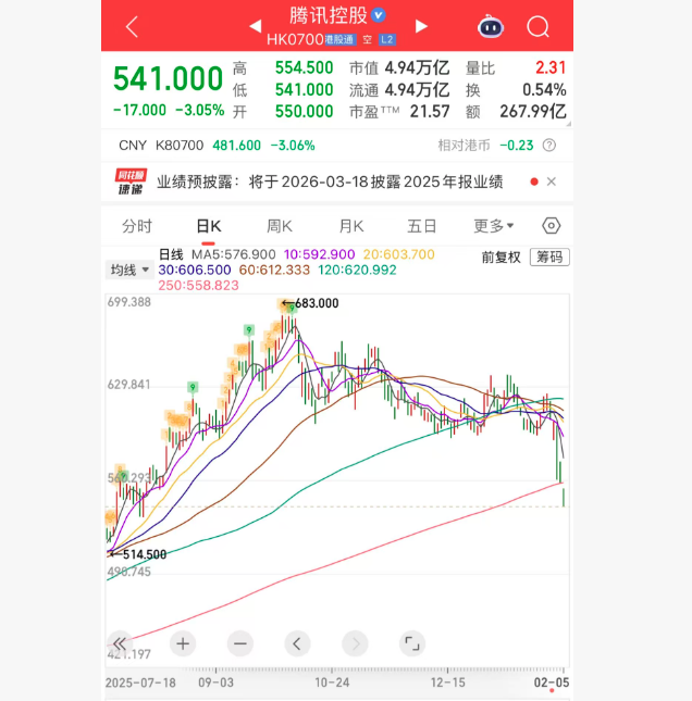 值得关心的是,腾讯控股股价已解析四个往昔日走低。行情数据露出,公司股价自1月30日下降2.57%运行,2月2日、3日、4日捏续下降,跌幅折柳为1.24%、2.92%、3.96%。
