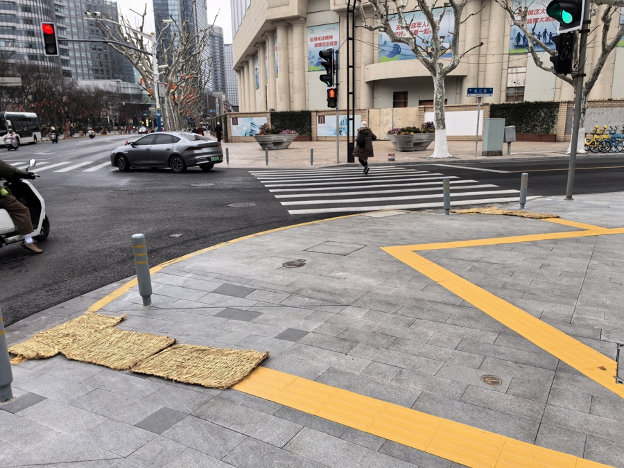节后首个责任日是雨天,四川北路虬江路路口的一小段新鲜铺设的盲说念,让不少途经市民体会到了眼下打滑的嗅觉,数位市民还因此跌倒。在向摆脱日报·上不雅新闻“民声纵贯车”的投诉中,他们殊途同归地形色这段盲说念“沾了雨水后稀零滑”,并质疑铺设盲说念使用的材质有问题。