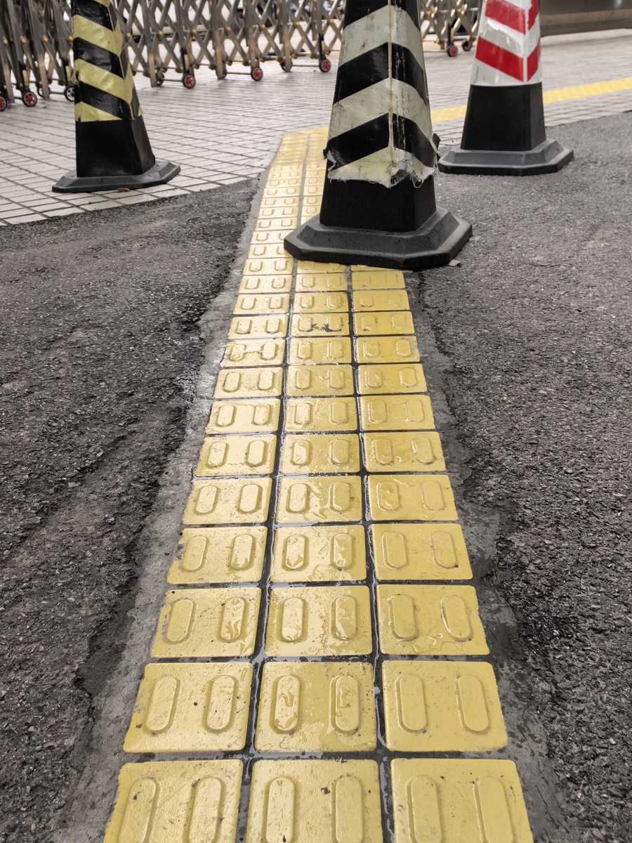 乍一看,一块块方形盲说念砖很平滑,远眺甚而还有一些反光。弯腰细看,条状和点状了得区域名义呈颗粒状,看起来有作念过防滑处理。但进一步触摸发现,颗粒状了得区域名义并不省略,整块盲说念砖名义似乎掩饰了一层釉质,很像常见的瓷砖。