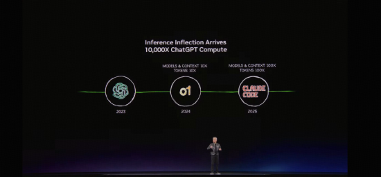从ChatGPT到AI Agent,算力破钞高出三个数目级在GTC大会上,一个长远的感受是:英伟达更愿将我方定位为“算法公司”,而非单纯的芯片供应商。黄仁勋在演讲中勾画出AI演进的三级跳——2023年ChatGPT开启生成式AI期间,2024年推理模子将算力破钞推升至10倍,2025年AI Agent则带来千倍级跃升。