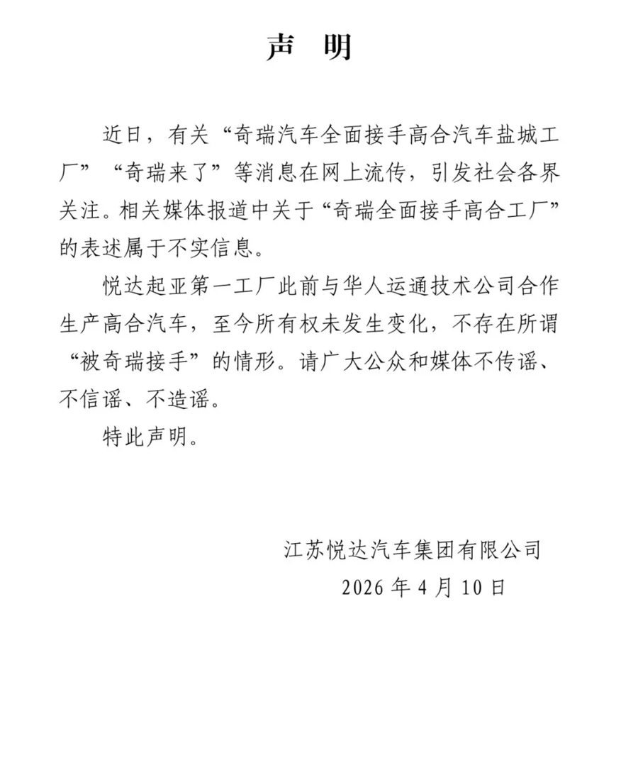 4月10日,江苏悦达汽车集团有限公司发布声明称,近日,相干“奇瑞汽车全面接办高合汽车盐城工场”“奇瑞来了”等音讯在网圣洁传,激勉社会各界讲理。“相干媒体报说念中对于‘奇瑞全面接办高合工场’的表述属于伪善信息。”同期,该声昭示意,悦达起亚第一工场此前与华东说念主运通工夫公司互助坐褥高合汽车,于今通盘权未发生变化,不存在所谓“被奇瑞接办”的情形。