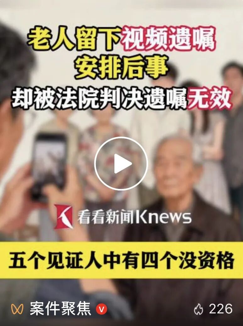 法院一查,发现视频遗嘱有两个致命硬伤:1. 视频里没记录关键信息:辛老伯和在场的五位见证人,都没对着镜头说自己的姓名、身份,也没说录制的年、月、日,不符合法律要求;